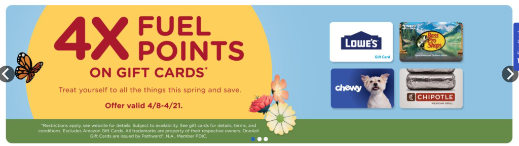 Kroger (including Kroger-affiliated chains) is offering 4x fuel points on all third party gift cards (excluding Amazon) and fixed value Visa and Mastercard gift cards ($25, $50 or $100)