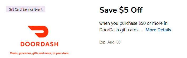 Kroger (including Kroger-affiliated chains) is offering 10% off $50 or more DoorDash gift cards.