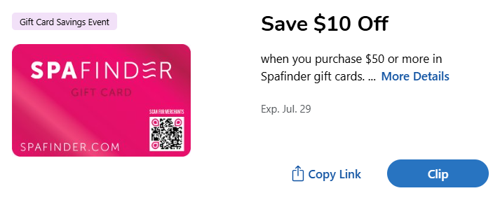 Kroger (including Kroger-affiliated chains) is offering 20% off $50 or more Spafinder gift cards.