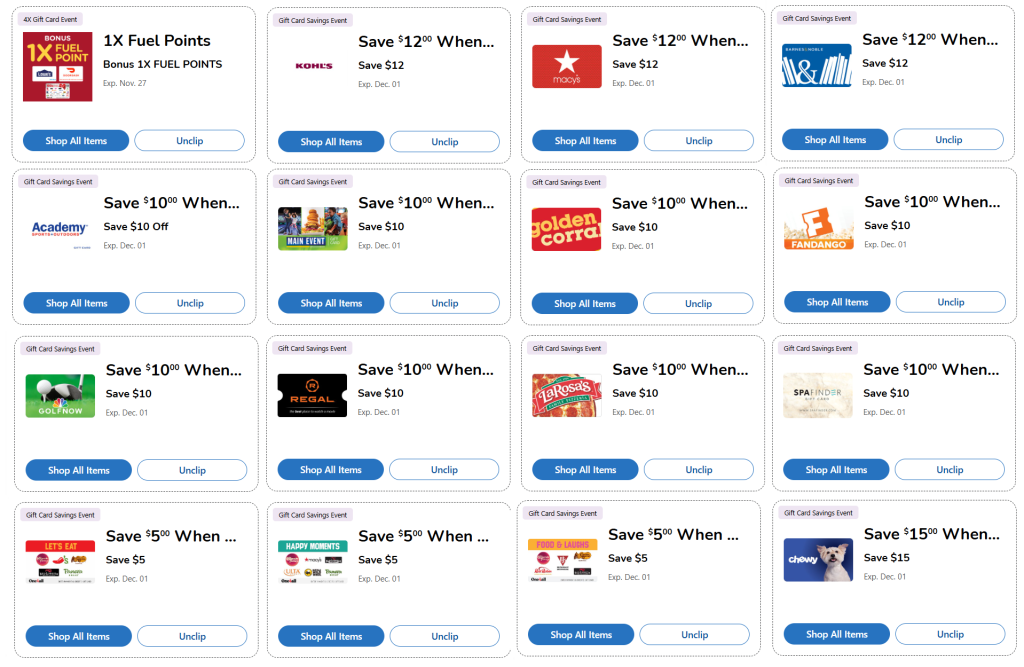 - 4x Fuel Point Gift Card and Bonus 1x Fuel Point Coupon must both be clipped in order to get maximum 5x fuel point on select gift card brands