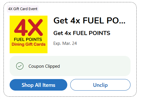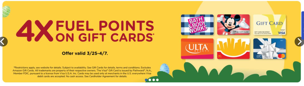 Kroger (including Kroger-affiliated chains) is offering 4x fuel points on dining gift cards: