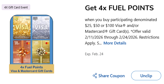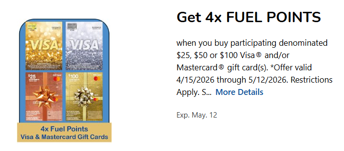 Kroger (including Kroger-affiliated chains) is offering 4x fuel points on fixed value Visa and Mastercard gift cards ($25, $50 or $100):