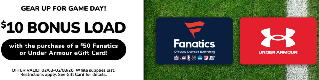 - Get a $10 bonus when you buy a $50 FANATICS eGift Card (Limit 1)