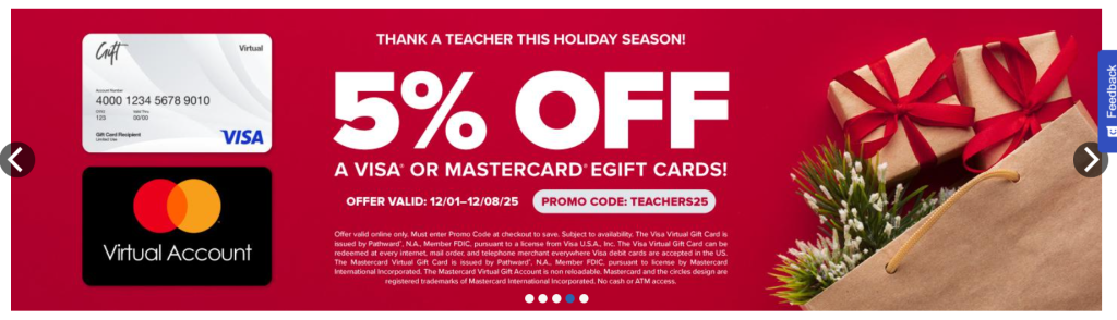 Pathward Visa and Mastercard gift cards are on sale at 5% off at Kroger.com in $25, $50 and $100 denominations. See terms for purchase fees. Promo code: TEACHERS25