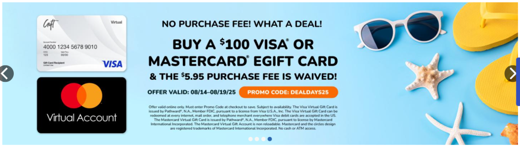 Buy a $100 Visa or Mastercard eGift Card using promo code DEALDAYS25, and the $5.95 purchase fee is waived