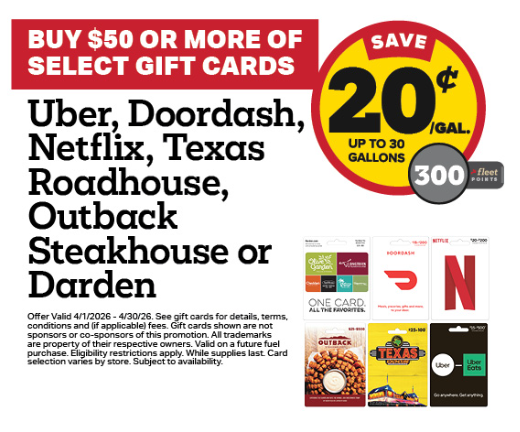 Buy one of the following gift cards and get 300 fleet points/20c off per gallon, for a single use up to 30 gallons: