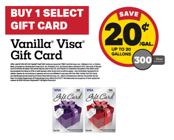 Buy one of the following gift cards and get 300 fleet points/20c off per gallon, for a single use up to 30 gallons: