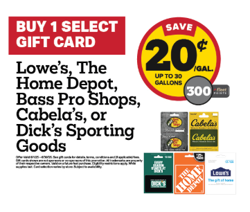 Buy one of the following gift cards and get 300 fleet points/20c off per gallon, for a single use up to 30 gallons: