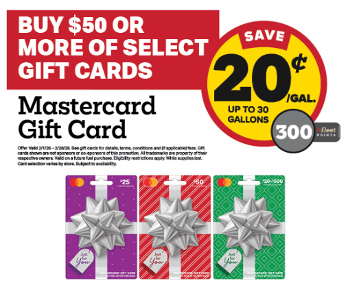 Buy one of the following gift cards and get 300 fleet points/20c off per gallon, for a single use up to 30 gallons: