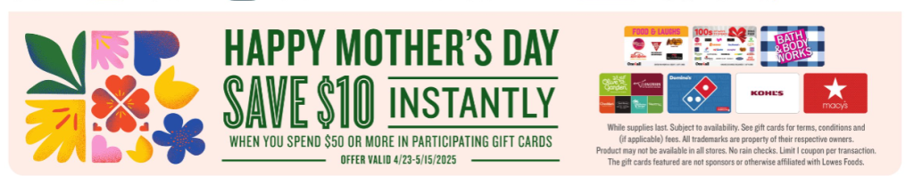 Save $10 instantly when you spend $50 or more in the following gift cards:
