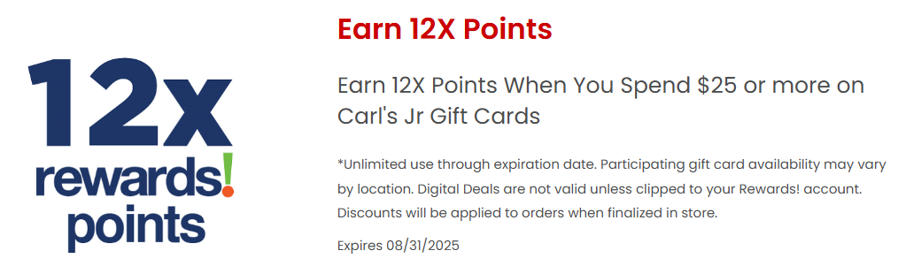 Earn 12X Points when you spend $25 or more on Carl’s Jr gift cards