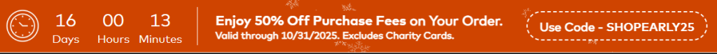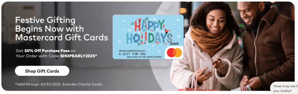 50% off purchase fees on Mastercard gift card orders with promo code: SHOPEARLY2025
