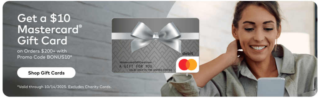 Get a $10 Mastercard Gift Card on Orders of $200 or more with promo code: BONUS10