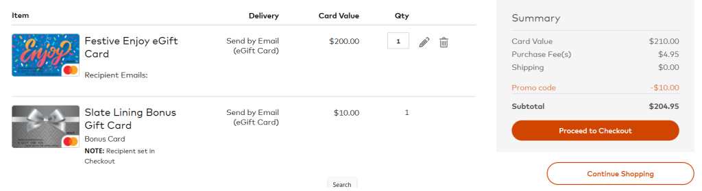 There is a $4.95 processing fee for a $200 egift card, which is the best value for this deal: