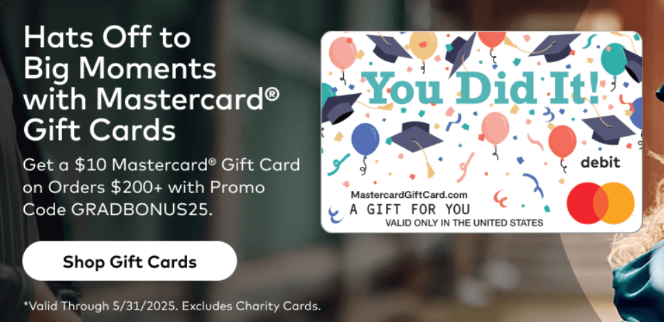 100% off purchase fees on Mastercard gift card orders of $200 or more with promo code: GRADBONUS25