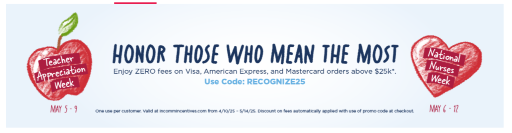 100% off purchase fees on Mastercard, Visa and American Express gift card orders above $25k with promo code: RECOGNIZE25