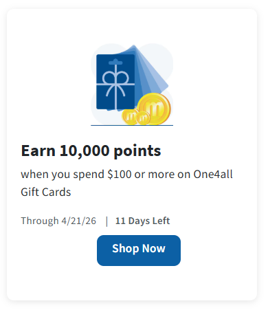 Earn 10,000 points when you spend $100 or more on One4All gift cards (excluding Giving Good and One4All Ultimate). No clipping needed, just enter mPerks ID at checkout: