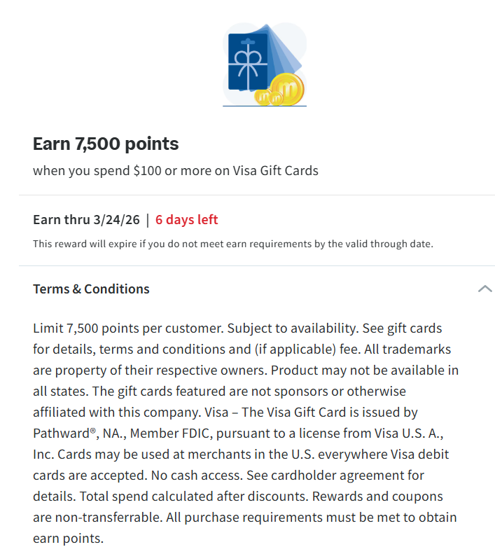 Earn 7,500 points when you spend $100 or more on Visa Gift Cards