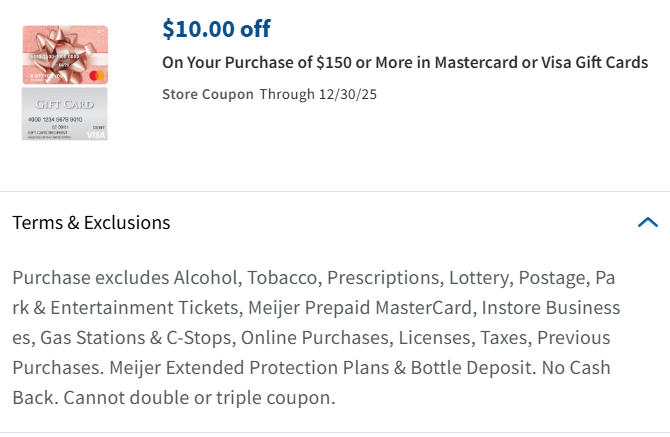- Purchase excludes Alcohol, Tobacco, Prescriptions, Lottery, Postage, Park & Entertainment Tickets, Meijer Prepaid MasterCard, Instore Businesses, Gas Stations & C-Stops, Online Purchases, Licenses, Taxes, Previous Purchases. Meijer Extended Protection Plans & Bottle Deposit