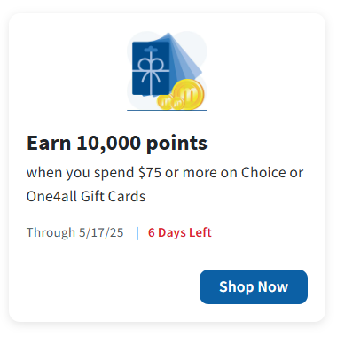 Earn 10,000 points when you spend $75 or more on Choice or One4All gift cards. No clipping needed, just enter mPerks ID at checkout