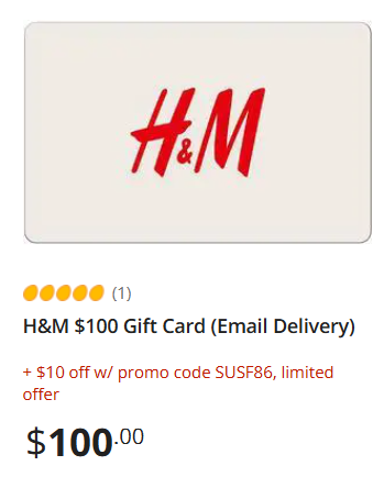 $10 off H&M $100 Gift Card (Email Delivery) with promo code SUSF86