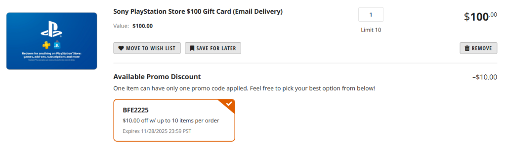 - $10 off Sony PlayStation Store $100 Gift Card (Email Delivery) for $90 with promo code BFE2225 at checkout.