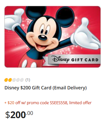 Get $20 off a Disney $200 Gift Card (Email Delivery) with promo code SSEES558
