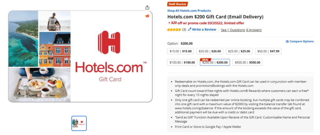 $20 off Hotels.com $200 Gift Card (Email Delivery) with promo code: SSCES522