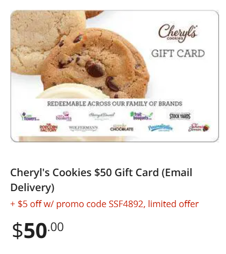 $5 off Cheryl’s Cookies $50 Gift Card (Email Delivery) with promo code SSF4892