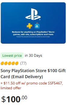 - $11.5 off Sony PlayStation Store $100 Gift Card (Email Delivery) for $88.50 with promo code SSF5467 at checkout (Eugene’s affiliate link).