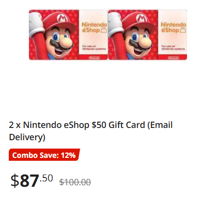 Buy 2 x Nintendo eShop $50 Gift Card (Email Delivery) and get 12.5% off at checkout. You need to use the special combo link, adding 2 $50 gift cards from the regular page won’t trigger the combo offer.