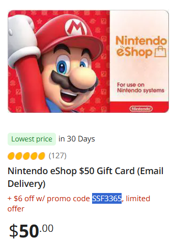 Get $6 off at checkout on Nintendo $50 gift card at Newegg using promo code SSF3365