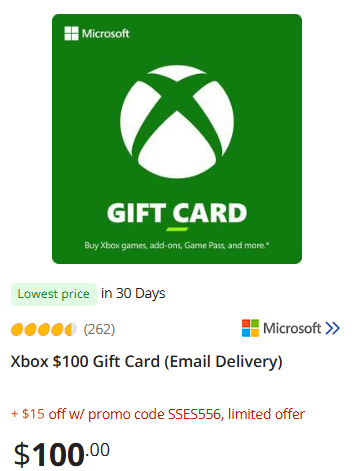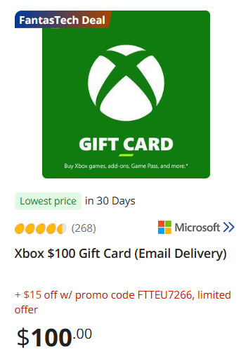 $15 off an Xbox $100 Gift Card (Email Delivery) with promo code FTTEU7266, limited offer