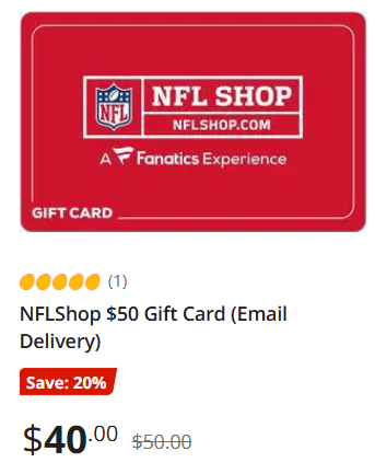 Save: 20% on NFL Shop $50 Gift Card (Email Delivery) , get $50 for $40 at Newegg.com