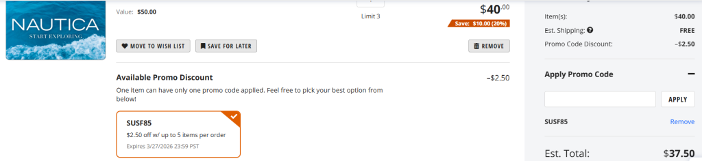 24% off at checkout on $50 Nautica $50 Gift Card (Email Delivery) for $37.50 with promo code SUSF85