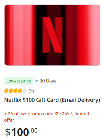 - Netflix $100 Gift Card (Email Delivery) for $95 with promo code SSF2557 at checkout.