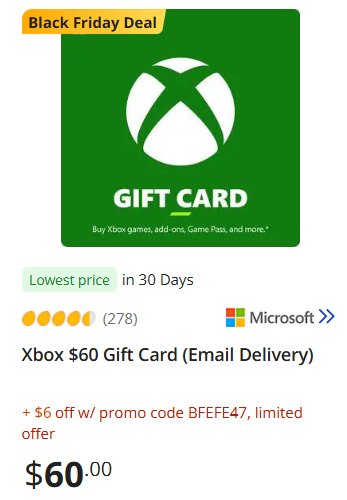 Get $6 off at checkout on Xbox $60 Gift Card at Newegg with promo code BFEFE47