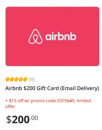 - $15 off Airbnb $200 Gift Card (Email Delivery) with promo code SSF5649