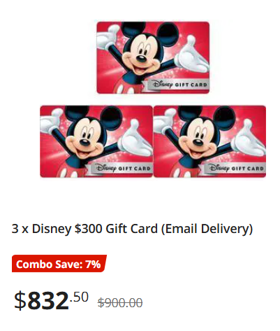 Get 3 x Disney $300 Gift Card (Email Delivery) or $832. Must use combo pack link , adding three separate $300 gift cards won’t trigger the promotion.