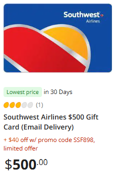- Southwest Airlines $500 Gift Card (Email Delivery) for $460 after $40 off with promo code SSF898