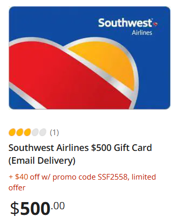 - Southwest Airlines $500 Gift Card (Email Delivery) for $460 after $40 off with promo code SSF2977