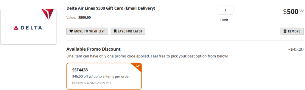 - $45 off Delta Air Lines $500 Gift Card (Email Delivery) with promo code SSF4438 at checkout.