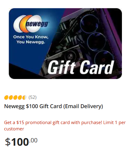 Get a $15 promotional gift card with the purchase of a Newegg $100 gift card.