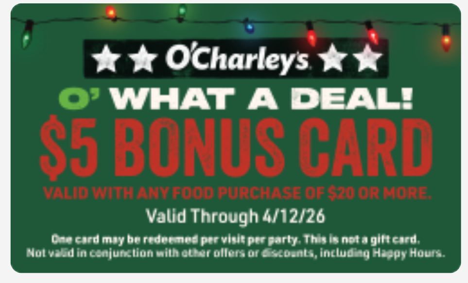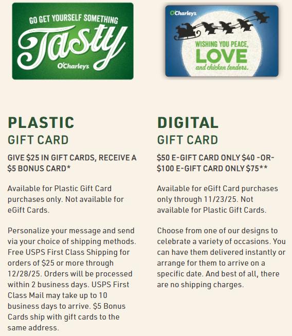 O’Charley’s: 20/25% Off O’Charley’s $50/$100 Digital Gift Cards | Buy $25 O’Charley’s Gift Card and Get a $5 Bonus Card Free