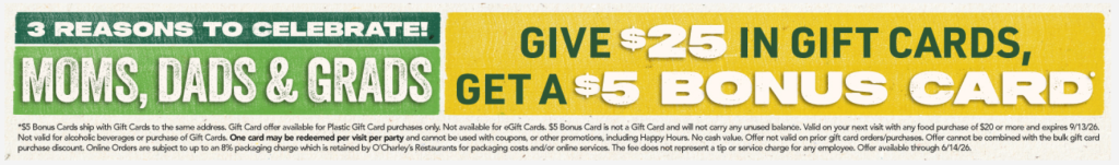 Promo bonus card on physical gift cards requires a minimum $20 food purchase and only one coupon can be used per visit. In addition, there is a $3.25 shipping fee. The bonus card expires 9/13/26.