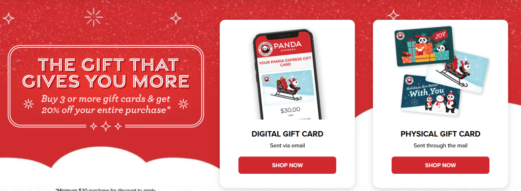 eGift Cards / Physical Gift Cards[EXPIRED] Panda Express: 20% Off When You Buy Three Panda Express Gift Cards November 30, 2025December 5, 2025 - by GCanywhere Staff - Leave a Comment The Deal Buy 3 or more gift cards and get 20% off you entire order. Direct link to offer Key Terms Offer valid November 28 – December 1, 2025 Minimum $30 purchase for discount to apply. Tips & Ideas