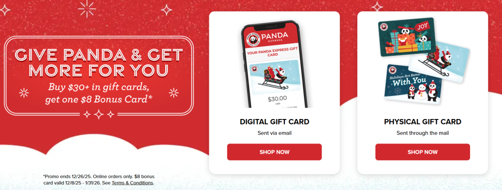 Order $30 or more in gift cards from the Panda Express website, and receive one (1) $8 bonus card.