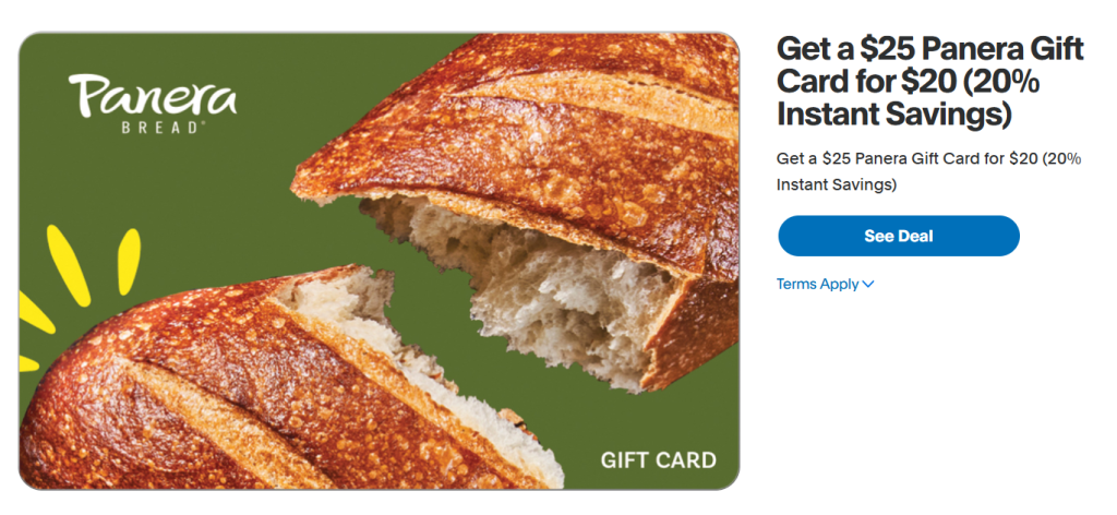 eGift Cards / Recurring Gift Card Deals[EXPIRED] PayPal Digital Gifts: 20% Off $25 Panera Bread Gift Card October 1, 2025November 1, 2025 - by GCanywhere Staff - Leave a Comment The Deal PayPal Digital Gifts Deals: Get a $25 Panera Gift Card for $20 (20% Instant Savings) Key Terms Valid October 1, 2025 – no expiration date specified Tips & Ideas Deal History December 2, 2024
