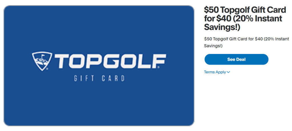 Active Gift Card Deals / eGift CardsPayPal Digital Gifts: 20% Off $50 Topgolf Gift Cards March 3, 2026March 3, 2026 - by GCanywhere Staff - Leave a Comment The Deal $50 Topgolf Gift Card for $40 (20% Instant Savings!) Key Terms Valid March 3, 2026 while supplies last Limit 1 per buyer Tips & Ideas