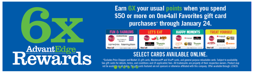 Price Chopper: Earn 6X AdvantEdge Rewards when you spend $50 on select gift card purchases: